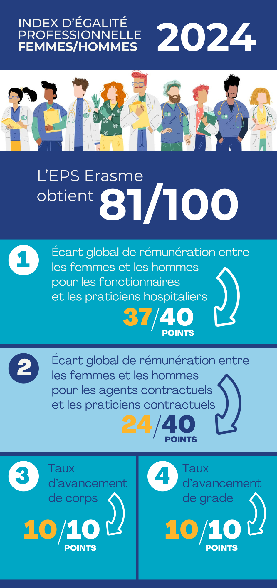 Pour l’année 2024, l’Index de l’égalité professionnelle de notre établissement est de 81/100.